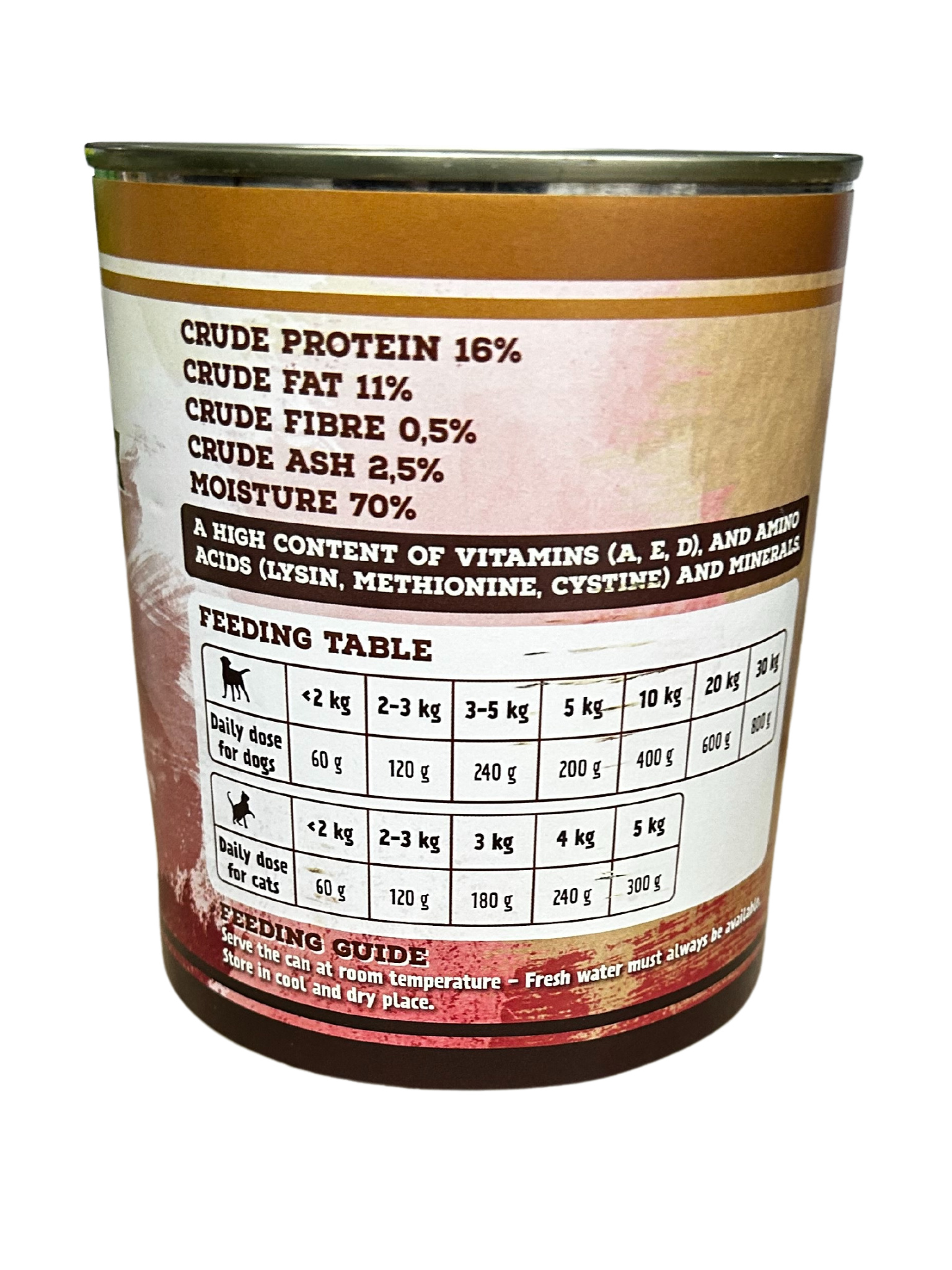 Analytické složky: Konzerva obsahuje vysoké množství přirozených vitamínů (A, E, D), aminokyselin (lysin, methionin, cystin) a minerálů.