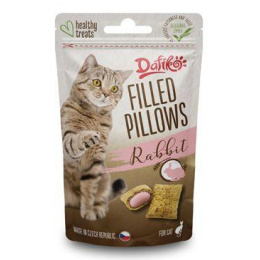 Pamlsek pro kočky ve formě plněných králičích polštářků.