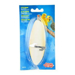 Sépiová kost s kovovým držátkem pro andulky a korely. Účinná pomůcka při obrušování zobáku a cenný zdroj vápníku pro ptáky.