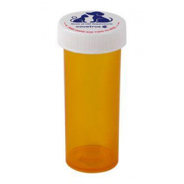 Lahvička na léky s dětským bezpečnostním uzávěrem, který je zapotřebí stlačit a otočit. Je označena logem Covetrus s dobře čitelnými pokyny k otevření a s velkou plochou pro označení.