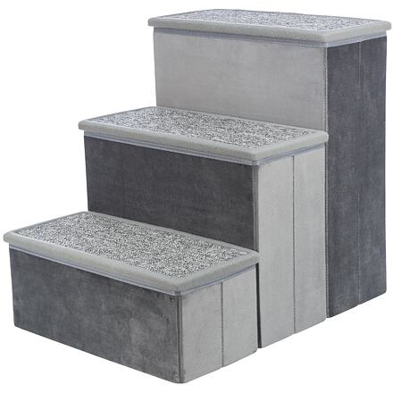 optimální pro malé, starší nebo nemocné psy a kočky pomáhají zvířeti dosáhnout vyšších míst bez nutnosti skákání kobercem pokryté schůdky pro bezpečnou chůzi s úložným prostorem uvnitř schodů (víka lze odklopit) celé schůdky lze snadno a rychle složit pouze pro vnitřní použití materiál: polyesterový potah sametov... více
