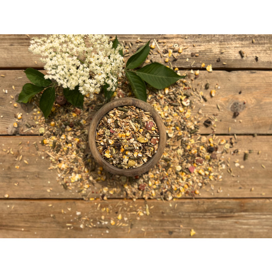 - Seno (0,5 %): Důležitý zdroj hrubé vlákniny pro správné trávení.