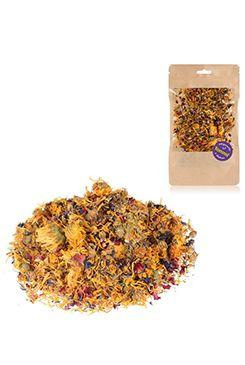 Sonnenland Rozkvetlá zahrada je ručně plněná směs sušených květů a bylin v nejvyšší BIO kvalitě. Je určena jako doplňkové krmivo pro králíky a hlodavce, kterým poskytuje přírodní zklidnění, podporu imunity a přirozenou detoxikaci organismu. Díky levanduli navíc pomáhá zmírnit stres u citlivých jedinců.
