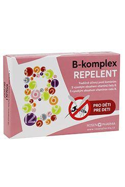 Rosen B-komplex REPELENT pro děti je doplněk stravy, který dodává tělu denní potřebu vitamínů skupiny B a má repelentní účinky proti komárům. Vitamín B1- thiamin, který je v přípravku obsažen, je tradičně využíván jako repelentní přípravek. B-komplex repelent tablety obsahují všech 8 esenciálních vitamínů skupiny B - vitaminy B1, B2, B6, B5, B3, B7, kyselinu listovou B9 a vitamín B12 kyanokobalamin.