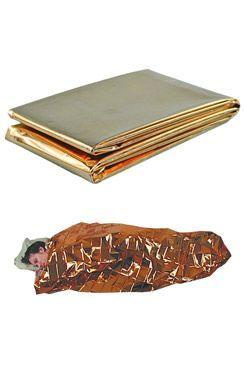 Záchranná přikrývka z metalické fólie chrání před prochladnutím, deštěm, horkem a větrem.